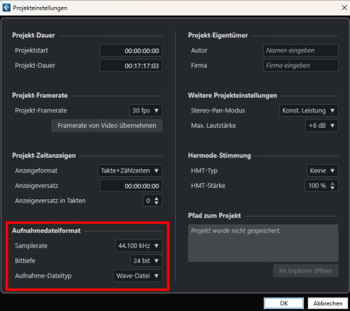 Cubase Projekteinstellungen